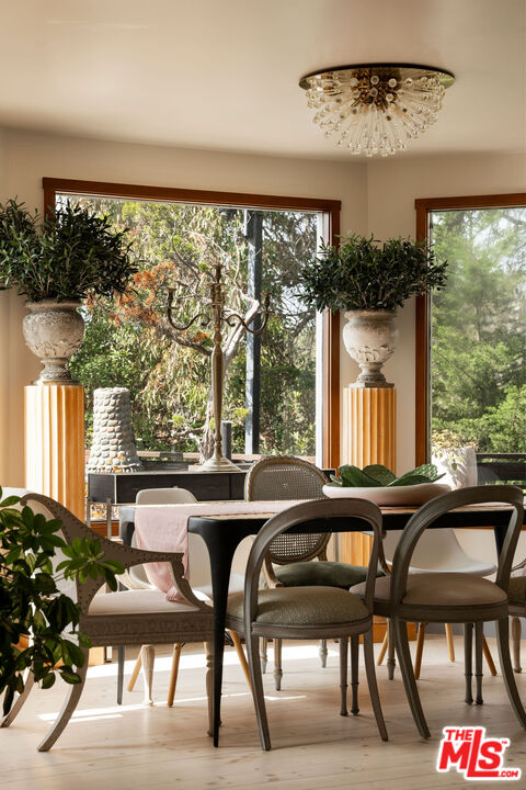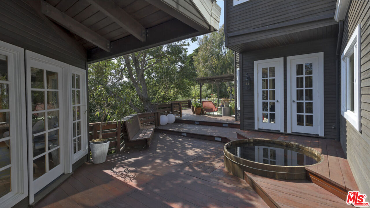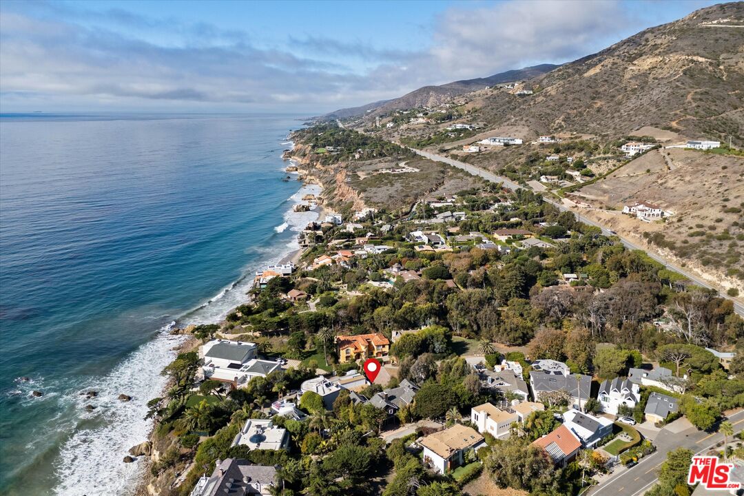 Nestled on a double lot in Western Malibu, this exceptional estate boasts a spacious, light-filled home with soaring ceilings, breathtaking ocean views, and lush landscaping, offering unparalleled privacy. The dual lots create a serene setting around the gated Cape Cod-style main residence and guest house, offering seamless indoor-outdoor entertaining spaces with the sounds of the waves as a backdrop. Inside, steeply pitched plank ceilings, skylights, generous built-ins, large windows, and wood floors define the open-concept design. The welcoming entryway leads to a dramatic two-story living room with ocean views, a cozy fireplace, a charming bay window, and a staircase leading to the upper level. A loft-style hallway lined with windows bathes the central living space in natural light. The adjacent kitchen is an entertainer's dream, featuring greenhouse skylights, stunning garden and ocean views, a glass-topped island with bar seating, premium appliances, an impressive butler's pantry, and a dining area wrapped in windows showcasing breathtaking ocean vistas. Just off the kitchen and living room, a wraparound wood deck offers a seamless extension of the living space, complete with a pergola-shaded lounge, dining area, outdoor sound system, and steps leading to a private courtyard with a hot tub. Upstairs, the home offers three beautiful bedrooms, including a luxurious primary suite with a serene ocean-view sitting area, a walk-in closet/safe room, and a spa-like bath with a free-standing tub. The additional bedrooms each feature bay windows with built-in seating, and one includes a charming ladder-access loft. Across the main-level deck, a separate two-story guest house/studio/office offers soaring wood-plank ceilings, a powder room, breathtaking views, and soundproofed wall is ideal for creative pursuits or work-from-home convenience. Additional highlights include a two-car garage, direct keyed beach access, air conditioning, central vacuum, a security system, and spectacular gardens with a waterfall, koi pond, detached writing studio/office, and meandering pathways. A rare offering, this estate epitomizes gracious living, breathtaking views, and the ultimate in private Malibu luxury.